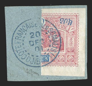 954 p Yvert #51a-57a A ImageYvert #51a-57a A, 1894 10c-50c Pictorial bisects, five different values, each tied to separate piece across the cut by neat blue Djibouti datestamp, very fine; 30c and 50c signed A. Brun (Scott #50a-56a var.). (Image) €2,640