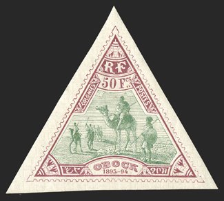 941 og Yvert #12b ImageYvert #12b, 1892 "OBOCK" Straightline overprint on 4c Claret on lavender, omitted overprint, top right corner margin vertical strip of three, the center stamp the error, fresh and intact, o.g., h.r., the error n.h., fine and scarce; signed Marquelet; ex-Gibralter (Scott #12 var.). (Image) €720+