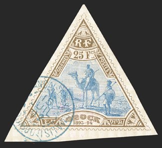 957 O Yvert #63 ImageYvert #63, 1894 25Fr. Brown and blue, used with neat blue 15 July 1902 datestamp, large margins, bright and fresh, very fine; signed Roumet (Scott #63; $600.00). (Image) €1,100