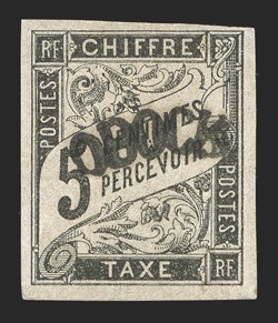 958 og Yvert #TT1 ImageYvert #TT1, 1892 "OBOCK" Curved overprint on 5c Black, an attractive mint example of this postage due rarity, with ample to mostly large margins all around, uncommonly fresh, o.g., relatively lightly hinged, very fine; the key stamp in completing an Obock collection, with a mere 25 stamps overprinted; signed A. Brun, Gilbert and Isaac (Scott #J1; $7,500.00). (Image) €12,600