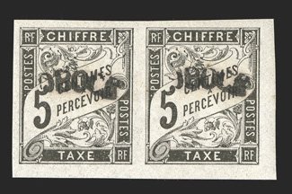 959 nhR Yvert #TT1a ImageYvert #TT1a, 1892 "OBOCK" Curved overprint on 5c Black, reprint overprint, horizontal pair, large to huge margins, immaculate o.g., n.h., extremely fine; both signed Roumet (Scott #J18 Footnote; $400.00 for hinged). (Image) for hinged €800
