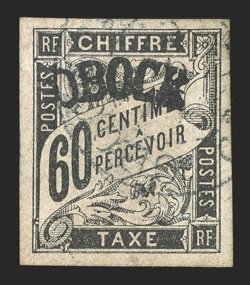 961 O Yvert #TT4 ImageYvert #TT4, 1892 "OBOCK" Curved overprint on 60c Black, used with light c.d.s. cancel, four large margins, very fine; signed Calves (Scott #J4; $400.00). (Image) €680