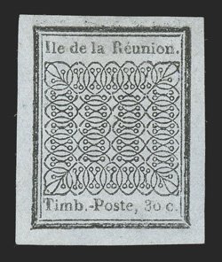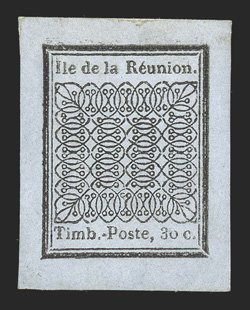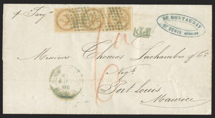 963 c   Image1854 Cover from Paris to Reunion, folded cover to St. Denis franked by France 1853 20c Blue on bluish and 80c Rose on pinkish (#14, 17), both with large margins, except 80c with nick in top left corner, tied by large square grid, "Paris/24 Dec, 54" departure postmark, "Via Suez, Ceylon, Maurice" directive, 4 May 1855 arrival backstamp, very fine usage to this scarce destination; signed Roumet. (Image) Est. $300-400
