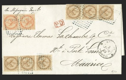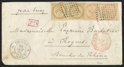 966 c   ImageFrench Colonies Yvert #3, 5, 1859 10c Bister on yellow and 40c Orange on yellowish, two vertical strips of three of former and vertical pair of latter, mostly large margins to touching one 10c strip, tied by diamond of dots grids to fresh 1869 folded letter to Mauritius, "St. Denis, Reunion/3 Janv, 69" datestamp, red boxed "PD" and backstamped Mauritius the next day, extremely fine; scarce and colorful inter-island franking; signed Calves and accompanied by his 2001 certificate (Scott #3, 5). (Image) Est. $500-750