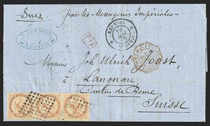 967 c   ImageFrench Colonies Yvert #5, 1859 40c Orange on yellowish, horizontal strip of three, mostly large margins to close at top, tied by two strikes of diamond of dots grid to fresh blue 1865 folded cover to Switzerland, clear "St. Denis, Reunion/19 Mai, 65" datestamp, "Suez" and "par les Menageris Imperiales" directives, red octagonal transit and boxed "PD", Marseille and Bern transit and Langnau arrival backstamps, fresh and very fine; a rare destination from Reunion (Scott #5). (Image) Est. $750-1,000