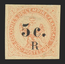 972 og Yvert #3 ImageYvert #3, 1885 "5c./R" Surcharge on 40c Orange on yellowish, large even margins all around, o.g., very fine (Scott #3; $400.00). (Image) €500