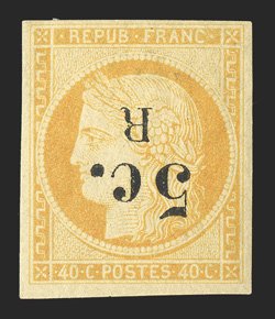 973 og Yvert #6aA ImageYvert #6aA, 1885 "5c./R" Surcharge on 40c Orange on yellowish, inverted surcharge, four ample to mostly large margins, bright and fresh, o.g., h.r., very fine; signed Bloch (Scott #6b; $900.00). (Image) €1,100