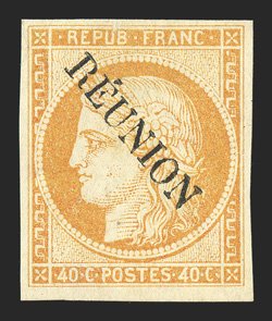 975 ng Yvert #11 ImageYvert #11, 1891 "REUNION" Overprint on 40c Orange on yellowish, unused as always, large margins all around, bright and fresh, choice very fine; signed Calves and Miro twice (Scott #11; $575.00). (Image) €650