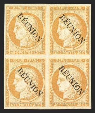 976 ngbl Yvert #11 ImageYvert #11, 1891 "REUNION" Overprint on 40c Orange on yellowish, unused as always, seldom seen mint block of four, large even margins all around, rich color on crisp white paper, extremely fine; signed Miro twice (Scott #11; $2,300.00 for singles). (Image) for singles €2,600