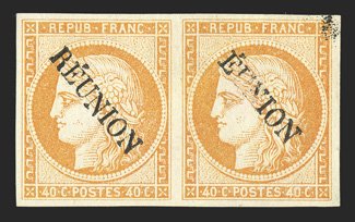 977 ng Yvert #11, 11a ImageYvert #11, 11a, 1891 "EUNION" Error overprint on 40c Orange on yellowish, unused as always, horizontal pair, the right stamp the error, four large even margins, bright color on fresh white paper, a bit of extraneous overprint ink in the top right corner which is characteristic of this, very fine; by far the rarest of all the "Reunion" overprint errors; signed Behr, Calves, Isaac and Roumet and accompanied by 2010 Roumet certificate (Scott #11h; $5,075.00 for singles). (Image) for singles €6,150