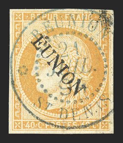 978 O Yvert #11a ImageYvert #11a, 1891 "EUNION" Error overprint on 40c Orange on yellowish, an exceedingly rare used example of this sought-after error, ample even margins all around, bright and fresh, neat blue "St. Denis, Reunion/24 Juil 94" datestamp, a bit of extraneous overprint ink in the top right corner which is characteristic of this; very fine and handsome; by far the rarest of all the "Reunion" overprint errors; signed Calves (Scott #11h; $4,500.00). (Image) €5,500