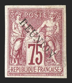 979 og Maury #12a ImageMaury #12a, 1891 "REUNION" Overprint on 80c Carmine on pinkish, omitted accent, exceedingly fresh mint single, four ample to large margins, vivid rich color, o.g., l.h., very fine; far more rare than its catalog value would indicate (Scott #12 var.). (Image) €700