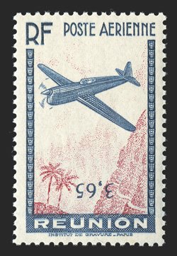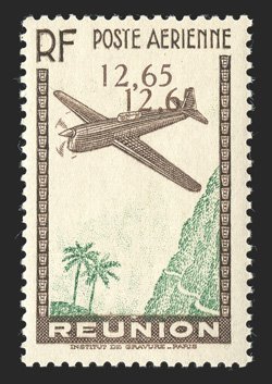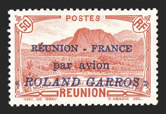 1004 nh Yvert #PA1 ImageYvert #PA1, 1937 "REUNION-FRANCE/par avion/ROLAND GARROS" Overprint on 50c Red, post office fresh and well centered, pristine o.g., n.h., extremely fine (Scott #C1; $500.00). (Image) Maury €625