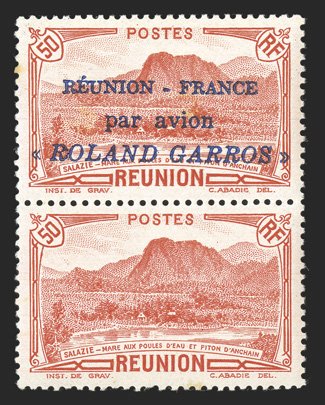 1005 nh Yvert #PA1a ImageYvert #PA1a, 1937 "REUNION-FRANCE/par avion/ROLAND GARROS" Overprint on 50c Red, one without overprint, vertical pair, the bottom stamp the error, well centered, strong and intact perforations, o.g., n.h., couple spots of light foxing, otherwise very fine and rare; signed A. Brun (Scott #C1a; $1,800.00 for hinged). (Image) for hinged €2,000