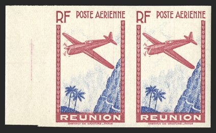 1009 nh Yvert #PA4e ImageYvert #PA4e, 1938 9.65Fr. Carmine and ultramarine, omitted value, imperforate, left sheet-margin horizontal pair, large even margins, pristine o.g., n.h., extremely fine (Scott #C4 var.). (Image) €1,050