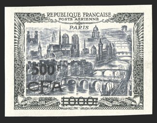 1010 og Yvert #PA51a ImageYvert #PA51a, 1951 "500F/CFA" surcharge on 1,000Fr. Sepia and black on blue, imperforate, huge margins all around, o.g., l.h., extremely fine (Scott #C41 var.). (Image) €600