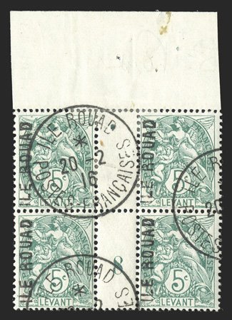1013 Obl Yvert #1 ImageYvert #1, 1916 "ILE ROUAD" Overprint on 5c green, rare top sheet-margin gutter block of four with millesimes "8", remarkably well centered, strong and intact perforations, cancelled by neat 20 February 1916 postmarks, very fine; only 1,200 stamps were overprinted (Scott #1; $1,000.00 for singles). (Image) for singles €1,120