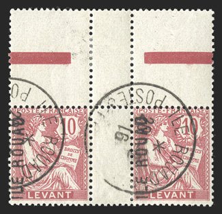 1012 nh Yvert #CP4a ImageYvert #CP4a, 1907 10c Brown and black, omitted black, top sheet-margin mint single, incredibly fresh and well centered, o.g., l.h. in the selvage, the stamp n.h., very fine; seldom offered never hinged; signed Roumet (Scott unlisted). (Image) for hinged €650