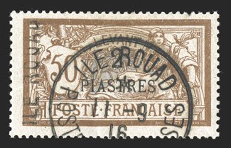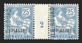 1015 og Yvert #2-3 ImageYvert #2-3, 1916 "ILE ROUAD" Overprints on 10c Rose red and on "1 PIASTRE 1" on 25c Blue, very rare mint horizontal gutter pairs with millesimes "4" and "2", the 10c with inverted surcharge reading down, well centered for these, fresh and intact, o.g., h.r., very fine; only 1,200 of each were overprinted; first signed Calves and the other signed A. Brun and Roumet (Scott #2-3; $2,000.00 for singles). (imagea) (Image) €2,300