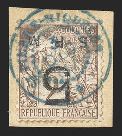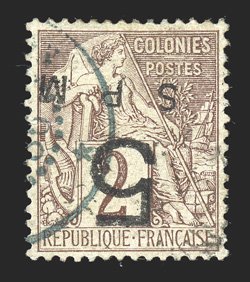 1018 p Yvert #1 ImageYvert #1, 1885 "5/S P M" surcharge on 2c Brown on buff, with inverted surcharge as always, hinged on small piece to which it was tied by well struck blue "St. Pierre-Miquelon/3 Dec 87" datestamp, uncommonly well centered, very fine and scarce; only 300 stamps were surcharged; signed Calves and Stanley Gibbons Ltd.; ex-Neal Allen (Scott #9; $2,500.00). (Image) €3,500