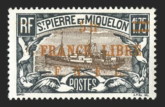 1024 og Yvert #245a ImageYvert #245a, 1942 "FRANCE LIBRE/F.N.F.L." and "5Fr" surcharge on 1.75 Fr. Black and dark brown, orange surcharge, desirable mint example of this rare stamp, precisely centered amid large margins, o.g., very lightly hinged, fresh and extremely fine; signed Calves (Scott #221 var.). (Image) €2,250