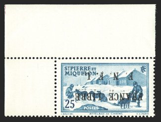 1026 nh Yvert #253A ImageYvert #253A, 1942 "FRANCE LIBRE/F.N.F.L." overprint on 25c Prussian blue, inverted overprint, handsome top left corner margin single, wonderfully fresh, o.g., n.h., very fine and rare; signed Calves and Rendon (Scott #229 var.). (Image) for hinged €1,500