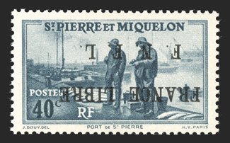 1028 nh Yvert #255A ImageYvert #255A, 1942 "FRANCE LIBRE/F.N.F.L." overprint on 40c Slate blue, inverted overprint, flawlessly centered and incredibly fresh, o.g., n.h., extremely fine and rare; signed Calves and Rendon (Scott #231 var.). (Image) for hinged €1,500