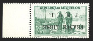 1029 nh Yvert #256A ImageYvert #256A, 1942 "FRANCE LIBRE/F.N.F.L." overprint on 45c Deep green, inverted overprint, left sheet-margin single, incredibly fresh and well centered, immaculate o.g., n.h., very fine and rare; signed Calves and Rendon (Scott #232 var.). (Image) for hinged €1,500