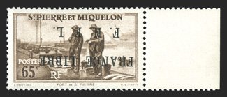 1031 nh Yvert #259A ImageYvert #259A, 1942 "FRANCE LIBRE/F.N.F.L." overprint on 65c Brown, inverted overprint, right sheet-margin single, choice centering, pristine o.g., n.h., extremely fine and rare; signed Calves and Rendon (Scott #235 var.). (Image) for hinged €1,350