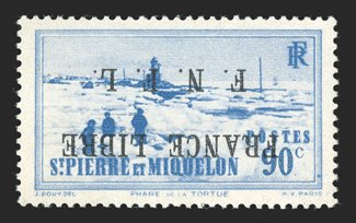 1032 og Yvert #262A ImageYvert #262A, 1942 "FRANCE LIBRE/F.N.F.L." overprint on 90c Ultramarine, inverted overprint, choice centering and fresh, o.g., l.h., extremely fine and rare; signed Calves and Fatoullah (Scott #238 var.). (Image) €1,500