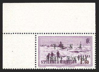 1033 nh Yvert #263A ImageYvert #263A, 1942 "FRANCE LIBRE/F.N.F.L." overprint on 1Fr. Pale olive green, inverted overprint, top interpane margin single, post office fresh and well centered, o.g., n.h., very fine and rare; signed Calves and Rendon (Scott #239 var.). (Image) for hinged €1,350
