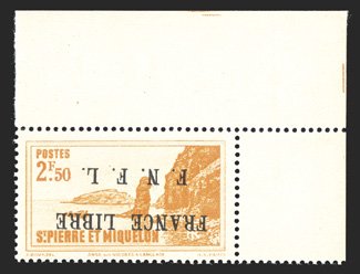 1038 nh Yvert #270A ImageYvert #270A, 1942 "FRANCE LIBRE/F.N.F.L." overprint on 2.50 Fr. Orange yellow, inverted overprint, striking top right corner margin single, post office fresh and well centered, o.g., n.h., extremely fine and rare; signed Calves and Rendon (Scott #246 var.). (Image) for hinged €1,350
