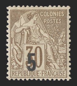 1044 og Yvert #2b ImageYvert #2b, 1887 "5" Ty. III Surcharge on 30c Brown on bister, select mint example of this scarce type, strong color on fresh paper, o.g., trivial h.r., very fine; signed Behr, Calves and Roumet and accompanied by 1998 Behr certificate; ex-Gilbert (Scott #7; $1,100.00). (Image) €1,700