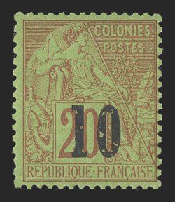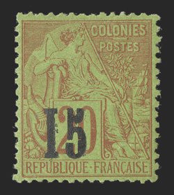 1049 og Yvert #5-5f, 5h, 5i ImageYvert #5-5f, 5h, 5i, 1887 "15" Ty. I-VII, IX and X Surcharges on 20c Red on green, fresh group of nine out of the ten different surcharge types, o.g., l.h. or h.r., fine-very fine; Ty. II signed Calves and Lemarie, Ty. X signed Roumet and Ty. VII accompanied by 2003 Roumet certificate (Scott #21-29; $809.00). (Image) €1,315