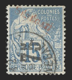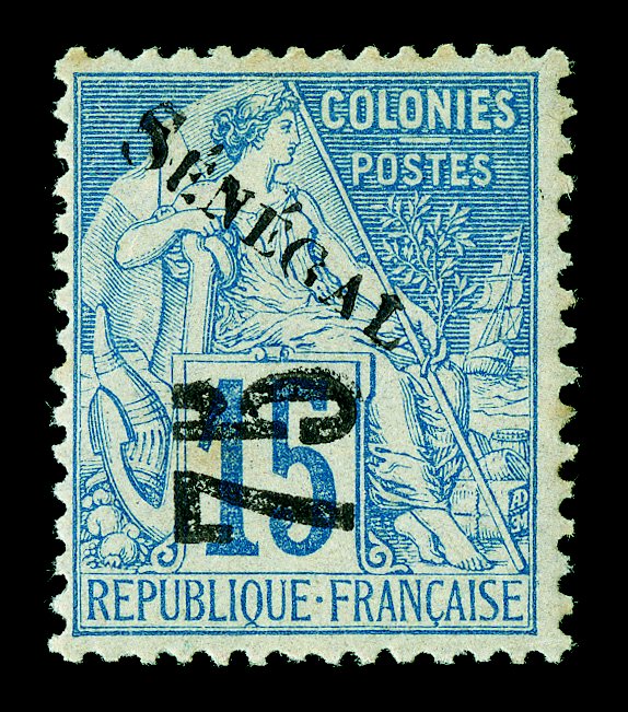 1054 O Yvert #6a ImageYvert #6a, 1892 Red "Senegal" Overprint and "75" surcharge on 15c Blue, an especially choice used example of this rarity, wonderfully well centered, good color on fresh white paper, neat c.d.s. cancel, extremely fine; a mere 50 stamps received the red "Senegal" overprint; signed Bloch, Calves and Gilbert (Scott #33; $5,000.00). (Image) €6,600