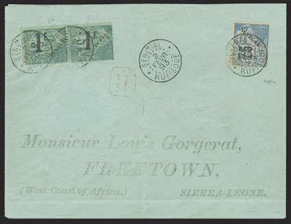 1052 c Yvert #6-7 ImageYvert #6-7, 1892 "Senegal" and "75" Surcharge on 15c Blue and "1F" surcharge on 5c Green on greenish, single of former and vertical pair of latter, tied to registered cover to Freetown, Sierra Leone by "Rufisque, Senegal/2 FEVR 93" datestamps, postmark repeated at center and Freetown backstamp, cover with vertical pocket fold at center, very fine (Scott #31-32; $525.00 for used). (Image) for used €690