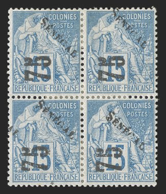 1053 ogbl Yvert #6 ImageYvert #6, 1892 "Senegal" and "75" Surcharge on 15c Blue, seldom seen mint block of four, beautifully centered, o.g., h.r.'s, very fine; with only 1,950 stamps having been surcharged, multiples are quite scarce; signed Calves and Miro (Scott #31; $1,700.00 for singles). (Image) for singles €2,120