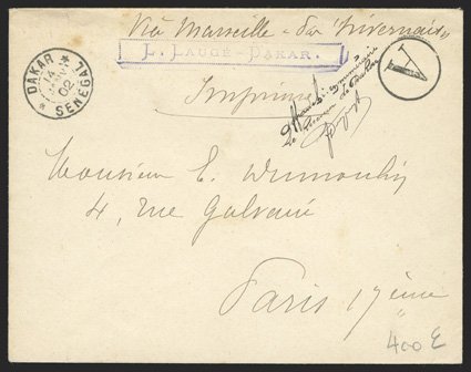 1055 c   ImageAffranchi en numeraire/Le receveur de Dakar in manuscript with postmaster's endorsement, plus "A" in circle, applied during a shortage of postage stamps in 1902 to cover to Paris, bold "Dakar, Senegal/14 JANV, 02" postmark, very fine. (Image) Est. $150-200