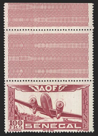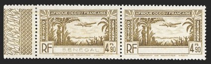 1057 og Maury #PA16a ImageMaury #PA16a, 1940 4.90Fr. Yellow bister, omitted "Senegal" inscription, left sheet-margin horizontal pair, the right stamp the error, fresh and intact, o.g., very lightly hinged, extremely fine; a rare se-tenant pair; signed A. Brun and Roumet (Scott #C15 var.). (Image) €3,000