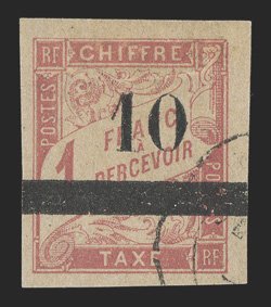 1059 O Yvert #TT3 ImageYvert #TT3, 1903 "10" Surcharge on 1Fr. Rose on buff, choice used example, four oversized margins, neat c.d.s. cancel confined to the bottom right, extremely fine; only 1,000 stamps were surcharged; signed Bloch and Champion (Scott #J3; $425.00). (Image) €580