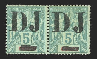 1060 og Yvert #1,1Ad ImageYvert #1, 1Ad, 1894 "D J" Overprint on 5c Green on greenish, bar doubled, horizontal combination pair, the right stamp normal and the left stamp the variety, rich color on wonderfully fresh paper, o.g., l.h., fine; a scarce se-tenant pair; both signed Marquelet and Roumet (Scott #1, 1b; $860.00 for singles). (Image) for singles €1,090
