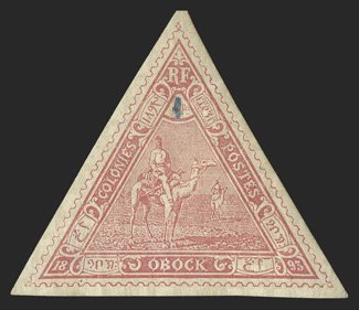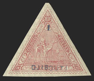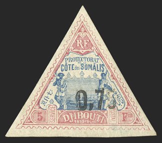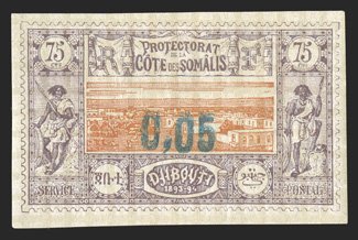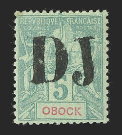1066 og Yvert #5 ImageYvert #5, 1894 "DJIBOUTI" Overprint on 5Fr. Carmine, select mint example, with intense color on fresh paper, generous margins, o.g., l.h., very fine; signed O. Roumet (Scott #5; $2,200.00). (Image) €2,300