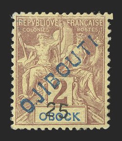1062 og Yvert #2 ImageYvert #2, 1894 "25" Surcharge and blue diagonal "DJIBOUTI" overprint on 2c Brown on buff, fresh and well centered, o.g., h.r., very fine (Scott #2; $375.00). (Image) €475