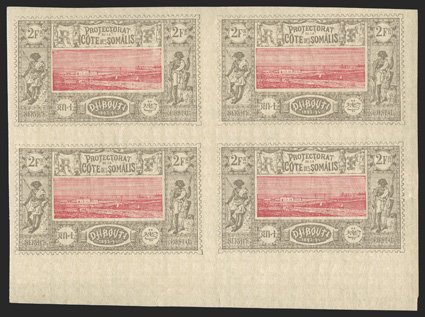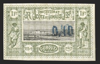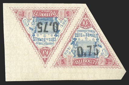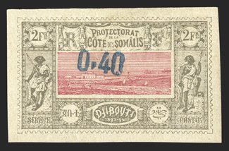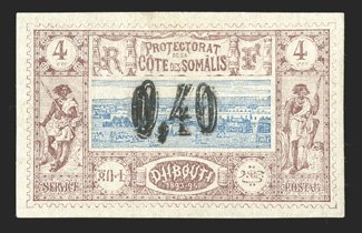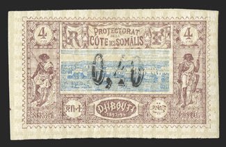 1065 og Yvert #4a ImageYvert #4a, 1894 "1" Surcharge on 5Fr Carmine, omitted "DJIBOUTI" overprint, a pleasing mint example of this rare error, bright and fresh, generous margins all around, o.g., l.h., very fine; signed A. Brun and Calves (Scott #4a; $5,000.00). (Image) €6,000