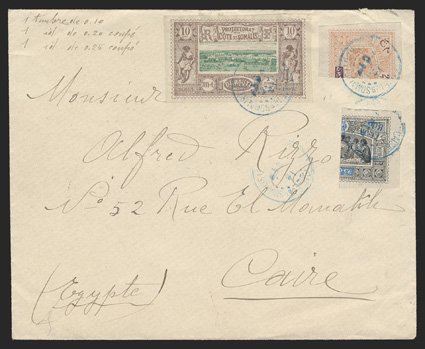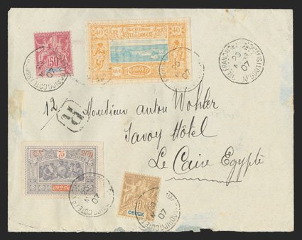 1071 c Yvert #14 ImageYvert #14, 1894 40c Orange and blue, tied along with Obock 1892 30c Brown on bister, 50c Carmine on rose and 1894 75c Grey lilac and orange (#40, 42, 58) to registered cover to Cairo by 20 March 1907 datestamps, octagonal French transit and Cairo and Savoy Hotel arrival backstamps, opened slightly roughly at bottom, very fine and colorful franking (Scott #15, Obock 40, 42, 57). (Image) Est. $200-300