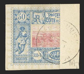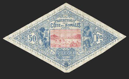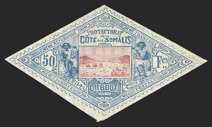 1063 O Yvert #3 ImageYvert #3, 1894 Blue "50" Surcharge and red diagonal "DJIBOUTI" overprint on 1c Black on blue, used with clear 1 February 1894 Obock datestamp, fresh and very fine; signed A. Brun twice (Scott #3; $275.00). (Image) €315