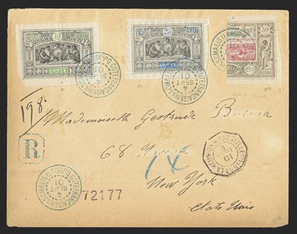 1070 c Yvert #13a B ImageYvert #13a B, 1894 30c Grey brown and rose bisect, the right vertical half, tied along with Obock 10c Black and green and 25c Black and blue (#51, 54) by blue "Cote Francaise des Somalis, Djibouti/4 SEPT, 01" postmarks to registered cover to New York, octagonal "La Reunion a Marseille, Lu No. 1/8 SEPT, 01" transit, very fine (Scott #14a, Obock 50, 53). (Image) Est. $200-300