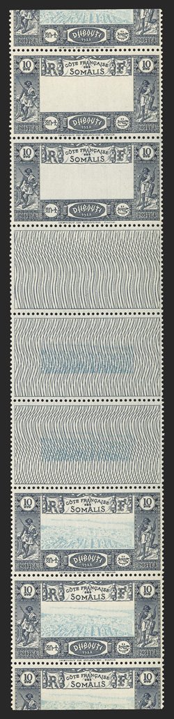 1101 nh Yvert #168a ImageYvert #168a, 1938 10Fr. Indigo and pale blue, omitted center, striking vertical triple gutter strip of four, the top pair the errors and the bottom stamps normal, plus the bottom two gutters show the vignette impressions that should have been on the top stamps, cut to include about half an additional stamp at both top and bottom, post office fresh, o.g., n.h., extremely fine (Scott #177 var.). (Image) Maury €1,610