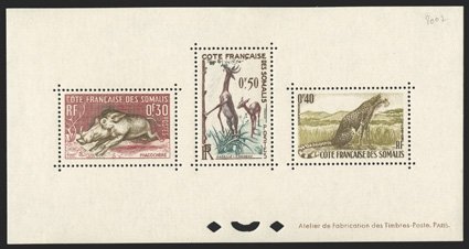 1105 og Maury #BS1 ImageMaury #BS1, 1958 30c-50c Nature protection special souvenir sheet, o.g. which is slightly disturbed from interleaving, very fine and quite scarce (Scott #271-73 var.). (Image) €800
