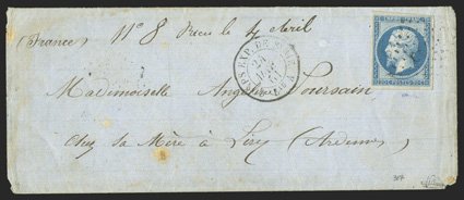 1106 c   ImageFrance Yvert #14, 1854 20c Blue, four margin single tied by lozenge of dots cancel with "COPRS EXP. DE SYRIE 24 MAR 61" c.d.s. on petite cover to France, four transit or receiving backstamps, cover with minor edge wear and a few light stains, fine and scarce; signed J-F Brun. (Image) Est. $200-300